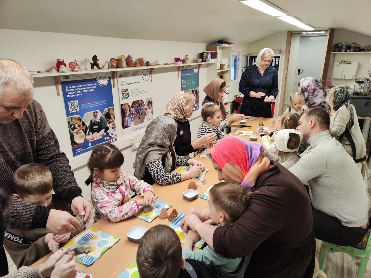 В рамках социального проекта «Больше, чем мастерская», целью которой является создание условий для возрождения, сохранения и передачи традиций православных праздников, гончарного ремесла и росписи по керамике, была также организована встреча с матушкой Евгенией. Матушка Евгения провела с ребятами беседу о глине и предметах, которые делают в мастерской, показала печь для обжига творений из глины и провела мастер-класс по созданию колокольчиков.